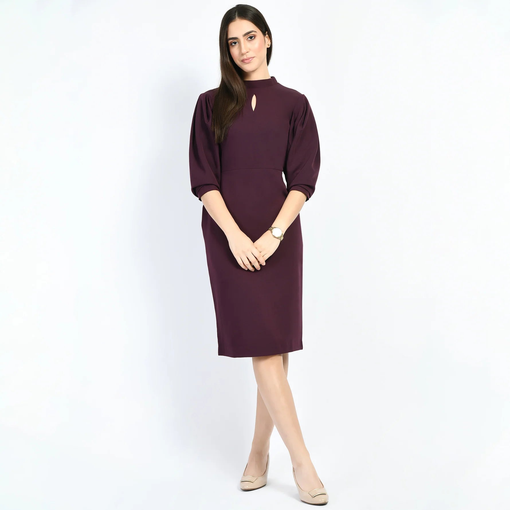 Beyond its structural and functional qualities, the dress embodies a timeless sense of fashion. The combination of a classic sheath silhouette with modern puffed sleeves creates a contemporary yet enduring design. It is a dress that transcends fleeting trends, making it suitable for women who appreciate both classic elegance and current fashion sensibilities. Its refined aesthetic ensures that it can be integrated into various wardrobes, complementing different personal styles, from minimalist chic to accessorized glamour. The dress offers a subtle sophistication that enhances confidence and presence without being overly dramatic, allowing women to express their personal style with grace and ease.