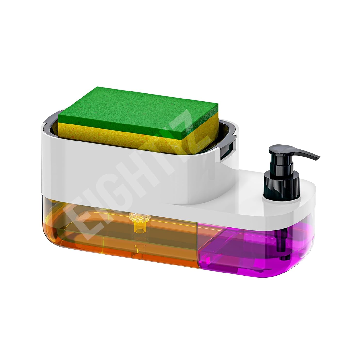 This kitchen and bathroom soap dispenser with sponge holder for countertop use is an essential accessory for maintaining a clean, organized, and functional space. Combining durability, smart design, and ease of use, it provides a practical solution for efficient cleaning and improved countertop organization in both kitchens and bathrooms.