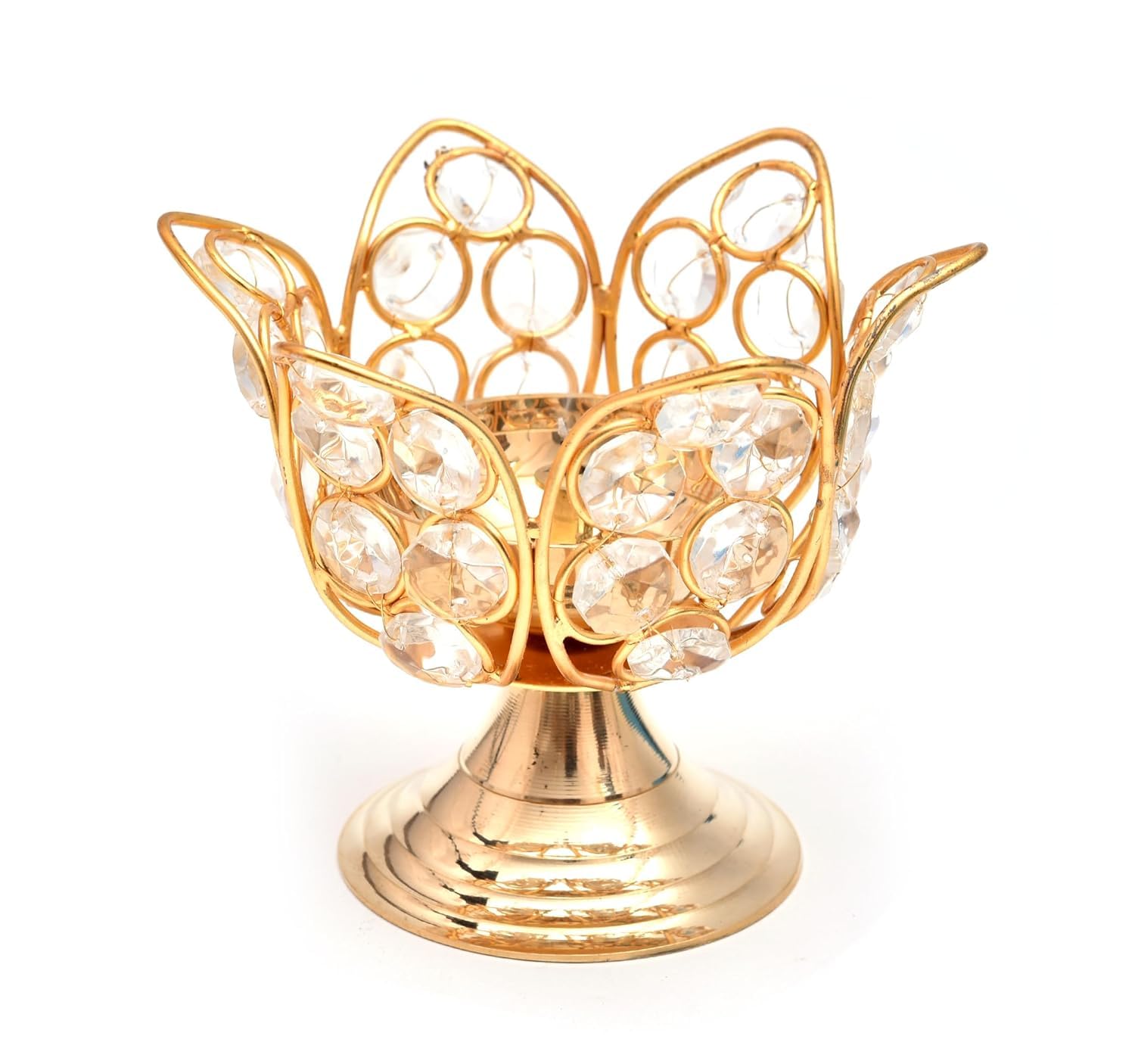 Ideal for festivals such as Diwali, Navratri, or other religious and cultural celebrations, the lotus diya enhances the festive ambiance with its warm glow and intricate design. Its compact size makes it easy to place individually or as part of a decorative arrangement, allowing for creative displays with multiple diyas, candles, or floral décor. The sparkling crystal accents further elevate its charm, reflecting light in a way that adds a magical, celebratory feel to any environment.